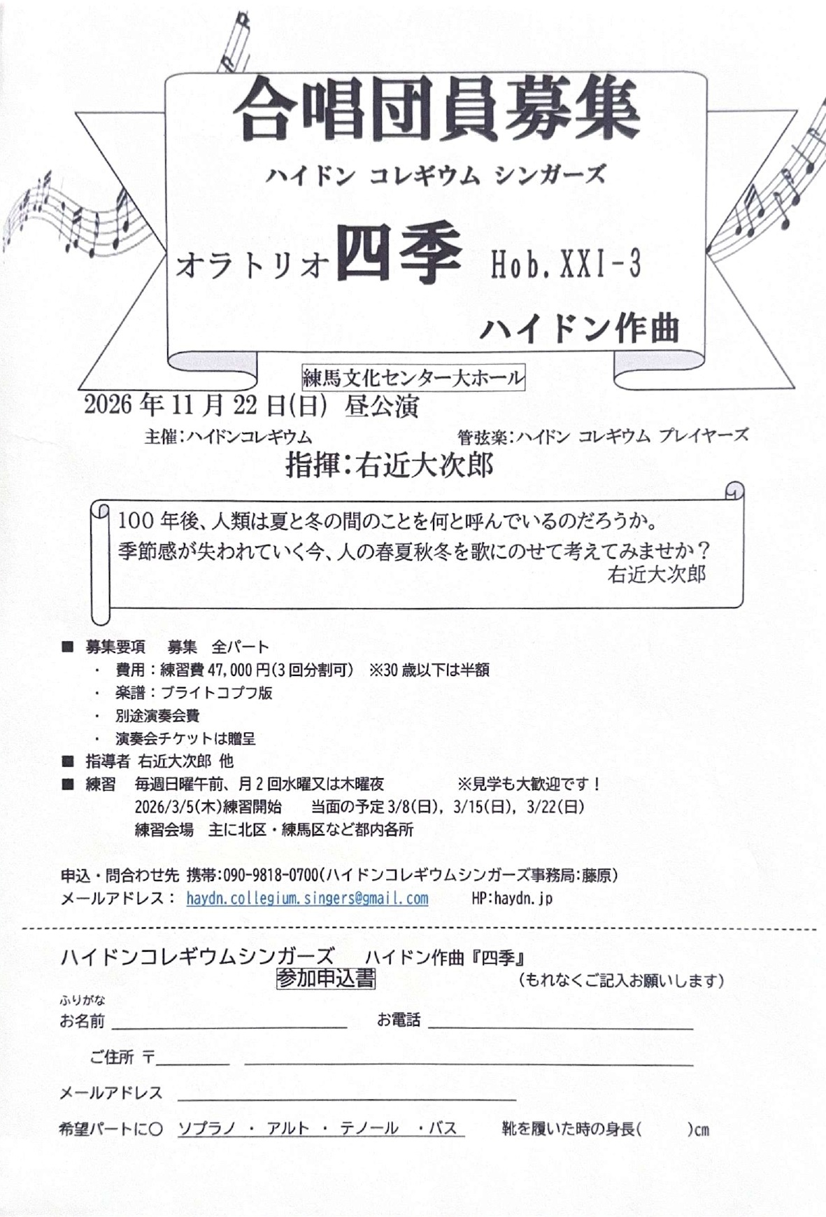 申込・問い合わせ先 携帯:090-9818-0700(ハイドンコレギウムシンガーズ事務局:藤原)